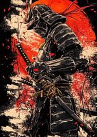 Het kunstwerk toont een geduchte Japanse samoerai gekleed in een ingewikkeld volledig harnas, zwaaiend met een glanzende katana. Tegen een opvallende achtergrond van een rode zon wervelen delicate rode kersenbloesems om hem heen, symbool voor schoonheid en de vergankelijke aard van het leven. Dit traditionele schilderij vangt de essentie van eer, dapperheid en cultureel erfgoed.