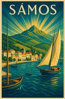 Deze Art Deco poster van Sámos laat het weelderige landschap, de charmante haven en de zeiltraditie van het eiland zien. Met zijn gestileerde zeilboten, stralende zonnestralen en levendige bergachtergrond combineert de compositie elegantie en nostalgie. Sámos is een plaats van mythe, schoonheid en erfgoed, bekend als de geboorteplaats van Pythagoras en om zijn weelderige wijngaarden. Het ontwerp benadrukt de harmonie tussen natuur en architectuur, met huizen aan de kust, blauw water en groene heuvels die samen een tijdloos tafereel vormen. Deze poster is perfect voor bewonderaars van de Griekse cultuur, zeilfanaten of iedereen met een voorliefde voor vintage reiskunst en voegt verfijning toe aan elke muur. De gedurfde kleuren en geometrische lijnen van de Art Deco stijl verheffen de natuurlijke schoonheid van het eiland en maken het zowel klassiek als modern. De Sámos-print is ideaal voor verzamelaars, reizigers of iedereen die de stralende geest van de Egeïsche Zee in huis wil halen.