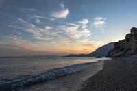 Landschap op het Griekse eiland Samos, tijdens zonsondergang. Je ziet het strand bij Kaladakia Beach, met rotsen en bergen op de achtergrond.