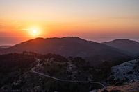 Landschap op het Griekse eiland Samos. De foto is gemaakt vanop mount Karvounis, op 1100 meter hoogte. De zon zakt en de lucht kleurt in prachtige oranje tinten. Je ziet een route in de bergen.