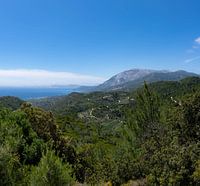 Landschap op het Griekse eiland Samos. Het is een heldere dag in mei. Achter de bergen zie je de Egeïsche zee.
