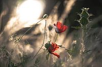 Close up van klaprozen in het gouden licht van de opkomende zon.