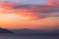 Landschap op het Griekse eiland Samos bij zonsopkomst. De lucht kleurt in de mooiste oranje tinten en de nevel hangt tussen de bergen.