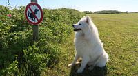Samoyed zit op het gazon voor een bord voor honden...