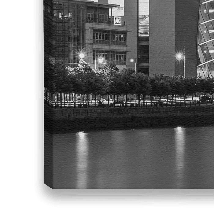 Een zwart-wit foto van een avond bij de Samuel Beckett-brug, een tuibrug over de rivier de Liffey in het havengebied van Dublin, Ierland. Een herkenbaar stukje architecuur van Santiago Calatrava.