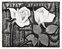Twee bloemen, beide een roos, staan op dit stilleven. De bloesem staat in zwart, wit en grijs afgebeeld.