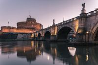 Zonsopkomst bij de San Angelo-brug en Castel Sant Angelo over de rivier de Tiber met het Mausoleum van Hadrianus in Rome, Italië.