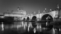 Een zwart-wit foto van een zonsopkomst bij de San Angelo-brug en Castel Sant Angelo over de rivier de Tiber met het Mausoleum van Hadrianus in Rome, Italië.