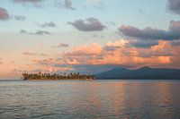 Zonsondergang op de tropische San Blas eilanden in Panama, met het vaste land op de achtergrond.