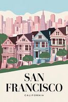 Kleurrijke Victoriaanse huizen steken harmonieus af tegen de skyline van San Francisco, met zachte pasteltinten die een uitnodigende warmte uitstralen. De gestileerde afbeelding brengt een gevoel van nostalgie en stedelijke charme over, perfect voor de woonkamer om vrienden en familie mee te nemen in een creatieve, inspirerende sfeer.