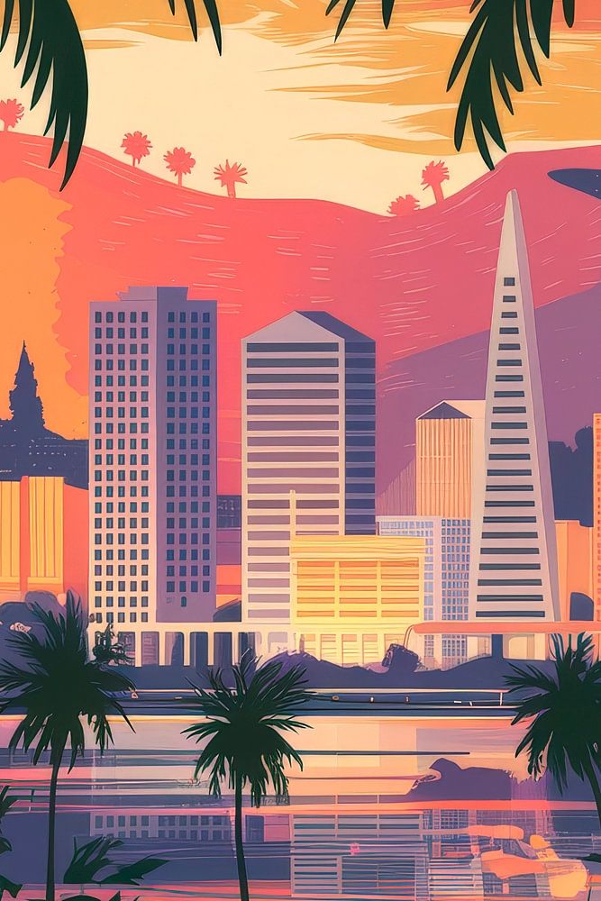 Een levendig stadsbeeld met palmbomen die de zonsondergang boven San José omlijsten, straalt een ontspannen vakantiesfeer uit. De zachte kleuren en moderne skyline doen denken aan de Californische levensstijl. Perfect voor de woonkamer om een uitnodigende, inspirerende sfeer te creëren die gesprekken stimuleert en vakantieherinneringen oproept.