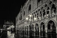 Het San Marco plein op de late avond. De regen zorgt voor reflectie van de straatlantaarns op de natte stenen van het plein.