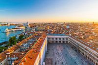 Ik maakte deze foto vanaf een verhoogd punt aan het einde van de dag toen het warme avondlicht over het San Marcoplein en de lagune reikte. De lange rij arcades trok het oog naar het plein terwijl Santa Maria della Salute en de eilanden de verre horizon bepaalden. Ik wilde oriëntatie en breedte, een uitzicht dat uitlegt hoe de stad het water ontmoet.