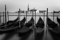 Een zwart-wit foto van een zonsopkomst in Venetië, met het uitzicht vanaf het beroemde San Marco plein met de Gondels en uitzicht naar de kerk van San Giorgio Maggiore.