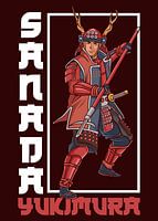 Sanada Yukimura, bekend om zijn moed tijdens het beleg van Osaka, is afgebeeld met een rood harnas en een speer. Zijn helm is versierd met een hertengewei, wat zijn krijgshaftige uitstraling benadrukt. Het tafereel straalt vastberadenheid, eer en vechtlust uit.