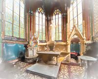Kansel met grote zonnige ramen. Digitale aquarel van een eigen foto.