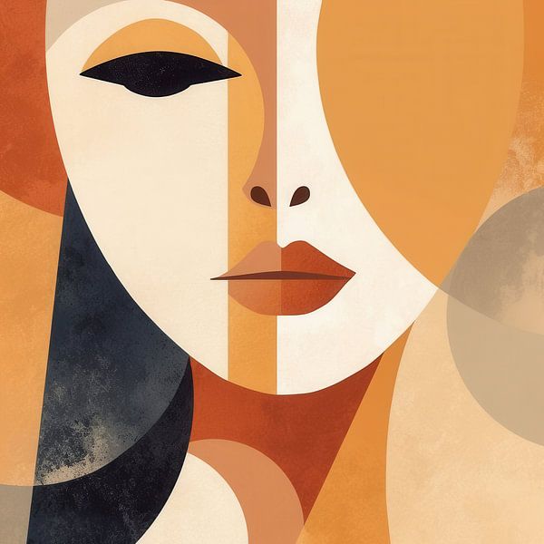 Een intrigerende compositie van een vrouwengezicht in een harmonieus, kubistisch blokpatroon. De complementaire kleuren sand, oker, antraciet en beige geven het werk een serene uitstraling, die wordt versterkt door de invloeden van de Romaanse kunst. Een fascinerende samensmelting van verschillende stijlen en elementen, vormen een…
