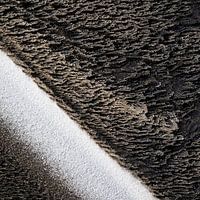 Op een zwart strand (lavazand) op ijsland is zand door een harde wind gemengd geraakt met sneeuw. Het zorgt voor bijzondere patronen en rijke kleuren. Groot afgedrukt kun je de zandkorrels haast voelen.