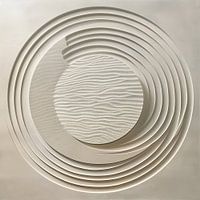 Modern abstracte afbeelding van meerdere cirkels. Half fibonacci. De cirkels zijn gemaakt in een mengsel van beton en zand. Dit geeft het een prachtige textuur. De texturen zijn fijn en suggeren fijn zand en zand met een golvende beweging. Samen wordt het een inspirerend geheel. Organische vormen en optische illusie. Passend bij diverse stijlen en trends, waaronder modern abstract, wit, natuurlij, Japandi. Artist: Bianca ter Riet