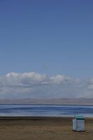 Sanitairgebouwtje aan het Issy Koel Meer in Kirgizie. Dit meer ligt aan de zijderoute richting Kashgar, China