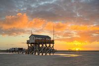 Zonsopgang bij de paalwoningen op het Böhlerstrand in Sankt Peter-Ording.