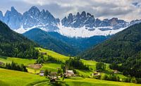 Santa Maddalena, ook bekend als St. Magdalena, is een schilderachtige middeleeuwse kerk in de noordelijke bergen van Italië. De Odle-berggroep van de Dolomieten torent uit boven de omliggende vallei en biedt een ongelooflijke achtergrond voor fotografie.