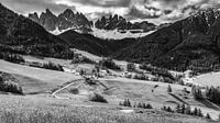 Een zwart-wit foto van Santa Maddalena, ook bekend als St. Magdalena, een schilderachtige middeleeuwse kerk in de noordelijke bergen van Italië. De Odle-berggroep van de Dolomieten torent uit boven de omliggende vallei en biedt een ongelooflijke achtergrond voor fotografie.