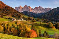 Dit is een beroemd panorama in het Val di Funes, of Villnöstal, een van de mooiste dalen in het Dolomieten gebergte in Italië. Het was adembenemend mooi om daar te staan en de warme kleuren te zien verschijnen op de Odle bergen in de verte, bij de ondergaande zon. De Santa Maddalena kerk en de herfstkleuren maken het helemaal af.