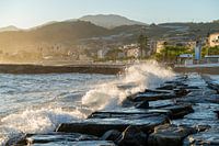 Idyllische kustimpressie met pier en grote golven in de avond rond Santo Stefano al Mare, een gemeente in de provincie Imperia in de Italiaanse regio Ligurië
