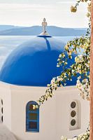 Over ‘Santorine, Griekenland Blauwe Koepel met Bougainvillea’ van Caroline Drijber