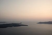 Landschapsfotografie bij zonsondergang aan zee. De foto toont het uitzicht vanaf het eiland Santorini op de vulkanische eilanden en Thirassia, met zacht warm licht van het "gouden" uur.