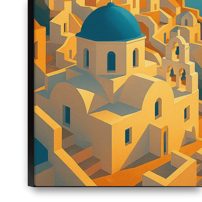 Dit kunstwerk vangt de verbluffende schoonheid van Santorini, Griekenland, met zijn witgekalkte huizen en blauwgekalkte kerken op kliffen boven de Egeïsche Zee. Ontworpen in een vintage art-decostijl, straalt de stralende zonsondergang gouden stralen uit over het tafereel, waardoor de architecturale harmonie van het eiland en het…