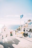Witte kerk klokken en een Griekse vlag op het eiland Santorini