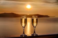 De prachtige zonsondergang werpt een gouden gloed over de caldera van Santorini, Griekenland, en wordt gevierd met twee glazen champagne.