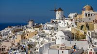 Opname van de skyline van Oia op Santorini met de twee karakteristieke windmolens