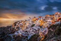 Het dorp Oia (Thira) met twee windmolens op het eiland Santorin in Griekenland in de Middellandse Zee tot aan de sfeervolle zonsondergang. De huizen en koepels van de kerken in blauw en wit worden verlicht door de vele kleine lampjes en dompelen het dorp Oia onder in een romantische sfeer. De zon is nu ondergegaan en aan de hemel kun je nog steeds de kleuren van de zomerse zonsondergang zien. Op de terrassen, in de restaurants en in de kronkelende huizen worden kleine lampjes en kaarsen aangestoken. Een betoverend romantische sfeer, typisch voor dit Griekse eiland in de Middellandse Zee.