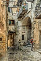 Saorge is een bergdorpje dat op het oog tegen de bergwand is opgebouwd. Het wordt verder getypeerd door smalle straatje en huizen die onderdoorgangen hebben en/of bruggetjes. Dit werk toont zo'n smal middeleeuws straatje waar al honderden jaren niets veranderd lijkt en waar je naar blijft kijken en jezelf verbazen. De straatlantaarn is typisch voor de bergdorpen in de Alpen-Maritiem.