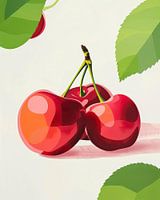 De kersen lijken bijna te glimmen tegen de minimalistische achtergrond, met groene bladeren die een natuurlijk kader vormen. Deze simpele, maar expressieve weergave van het fruit maakt een krachtig visueel statement.