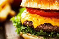 Sappige laagjes mals vlees, gesmolten kaas en verse groenten komen samen in deze smakelijke burger. De goudbruin gebakken broodjeskorst en de knapperige frietjes op de achtergrond doen je watertanden. Perfect voor een uitnodigende keuken die plezier en gezelligheid uitstraalt.
