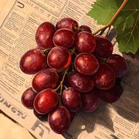 De foto toont een weelderige druiventros die kunstig is gerangschikt op oud krantenpapier. De rijke, dieprode kleurschakeringen van de druiven stralen frisheid en sappigheid uit. De delicate bladstructuur vult het arrangement aan en brengt een stukje natuur in deze rustieke compositie, waarbij het samenspel van fruit en texturen op meesterlijke wijze wordt benadrukt.