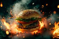 Koop de foto Sappige hamburger in brand - Apocalyptisch van Poster Art Shop op canvas, aluminium dibond, (ingelijste) fotoprint, behang en ArtFrame, op maat geprint in Fine-Art kwaliteit.