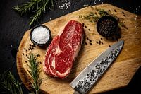 Sappige rauwe rib eye. Een klant vroeg me om een foto te maken voor haar keuken, met vlees en mes. Dus nam ik een paar verschillende composities. Hier is er een van