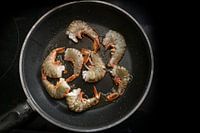 Sappige verse zwarte tijgergarnalen worden geroosterd in een zwarte pan op het fornuis, koken een smakelijke maaltijd voor een laag koolhydraatdieet, hoge hoek uitzicht van bovenaf, geselecteerde focus