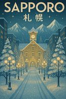 Sapporo Winter Wonderland - Besneeuwde stadslandschap & Mountain Glow Poster van Travel Shop