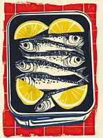 Een open sardineblik, grafisch gestileerd met heldere zwarte lijnen, citroenschijven en rode achtergrond. Deze retro illustratie straalt eenvoud en karakter uit en is perfect voor een moderne of industriële keuken.