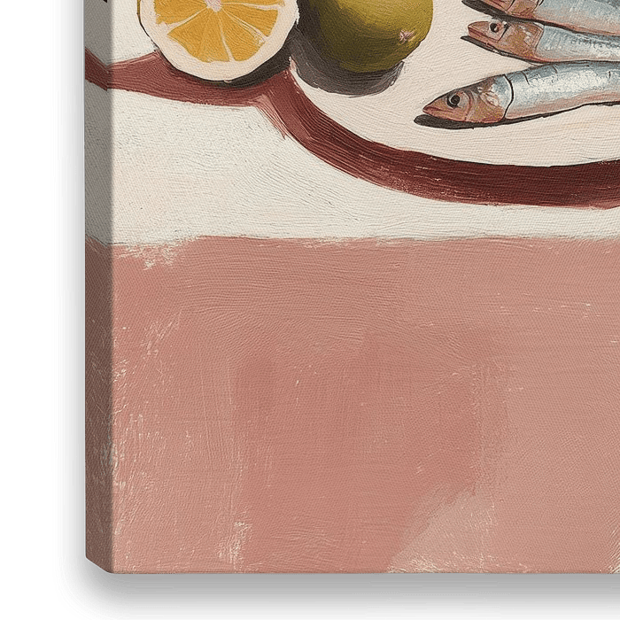 Dit stijlvolle stilleven voelt als een mini-vakantie aan tafel: een glas rosé, zilverblauwe sardientjes op een wit bord, een halve citroen en een limoen. Alles is geschilderd met zichtbare penseelstructuur en rustige, matte vlakken in teal, crème en terracotta. De compositie is minimalistisch maar warm, met net genoeg contrast door het…