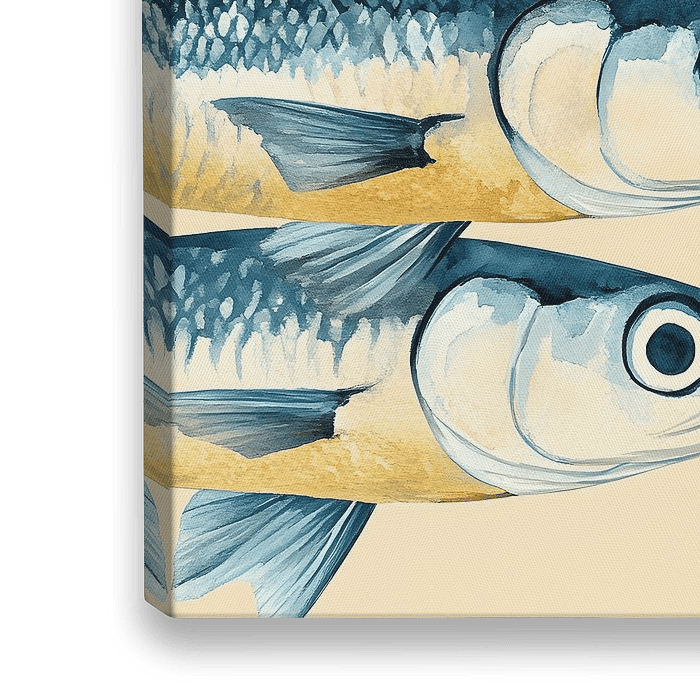 In dit kunstwerk wordt de sardines tot leven gebracht in een mix van vintage kleuren en tinten, die prachtig samensmelten en de zomerse sfeer oproepen.