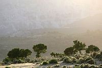 Boompjes in een bergvallei op het Italiaanse eiland Sardinië, gefotografeerd bij het tegenlicht van de late middagzon.