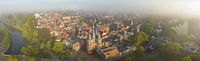 Gezicht op de Sassenpoort in Zwolle, Overijssel, Nederland tijdens een mooie zomerochtend met een wazige mist over de stad van bovenaf gezien. De Sassenpoort werd begin 1400 gebouwd als onderdeel van de vestingwerken van de stad. Het diende zowel defensieve als symbolische doeleinden, want het was een symbool van de rijkdom en macht van…