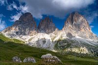 Hoog in de Italiaanse dolomieten, uitzicht op de Langkofel / Sasso Lungo, een hoge piek in dit bijzonder fraaie gebergte, vanaf een alpenweide.